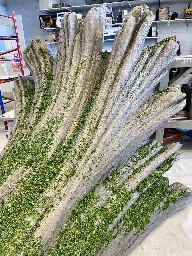 This was my first big project as an apprentice. The tree was already carved out of foam before I arrived, the other apprentice and I were tasked with the long process of giving the tree its bark texture and finish. Like our other foam sculptures, the process started with glue and cheesecloth. However, in this case, the cheesecloth was applied in a way to create the base bark texture. It was scrunched and layered in a way that modeled the bark effect. Then different mixtures were layered on top to further pronounce these ridges, applied with anything from our fingers to hair combs. I also was tasked creating and mixing the moss for the final touches after the tree was painted.
